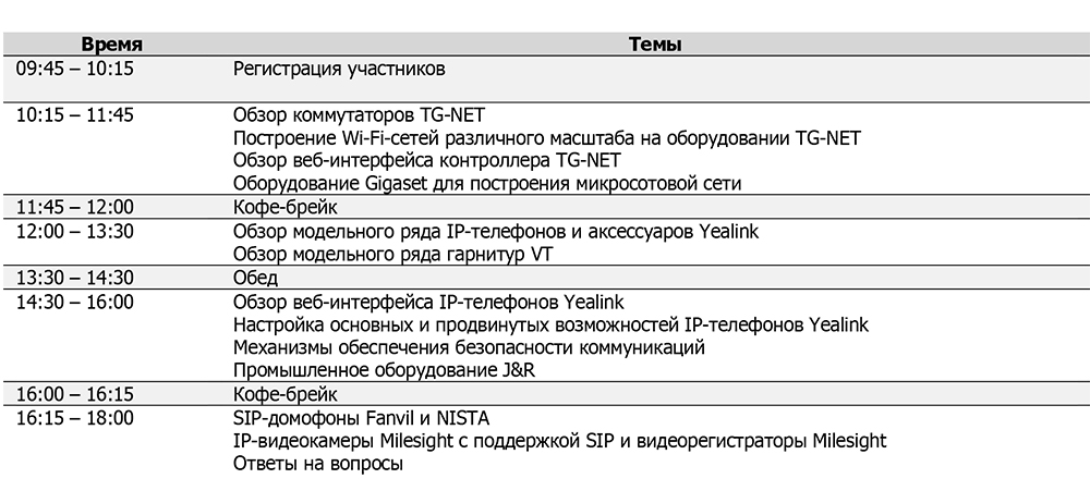 11 сентября состоится конференция, посвященная продуктам для построения телекоммуникационных сетей. В ходе встречи будут рассмотрены IP-телефоны и АТС, ВКС-системы, программное обеспечение, видеонаблюдение и многое другое. Участников мероприятия ждут подробные презентации о новых разработках и решениях Yealink, Yeastar, 3СХ, TG-NET, Wi-Tek, а также обзор других брендов.